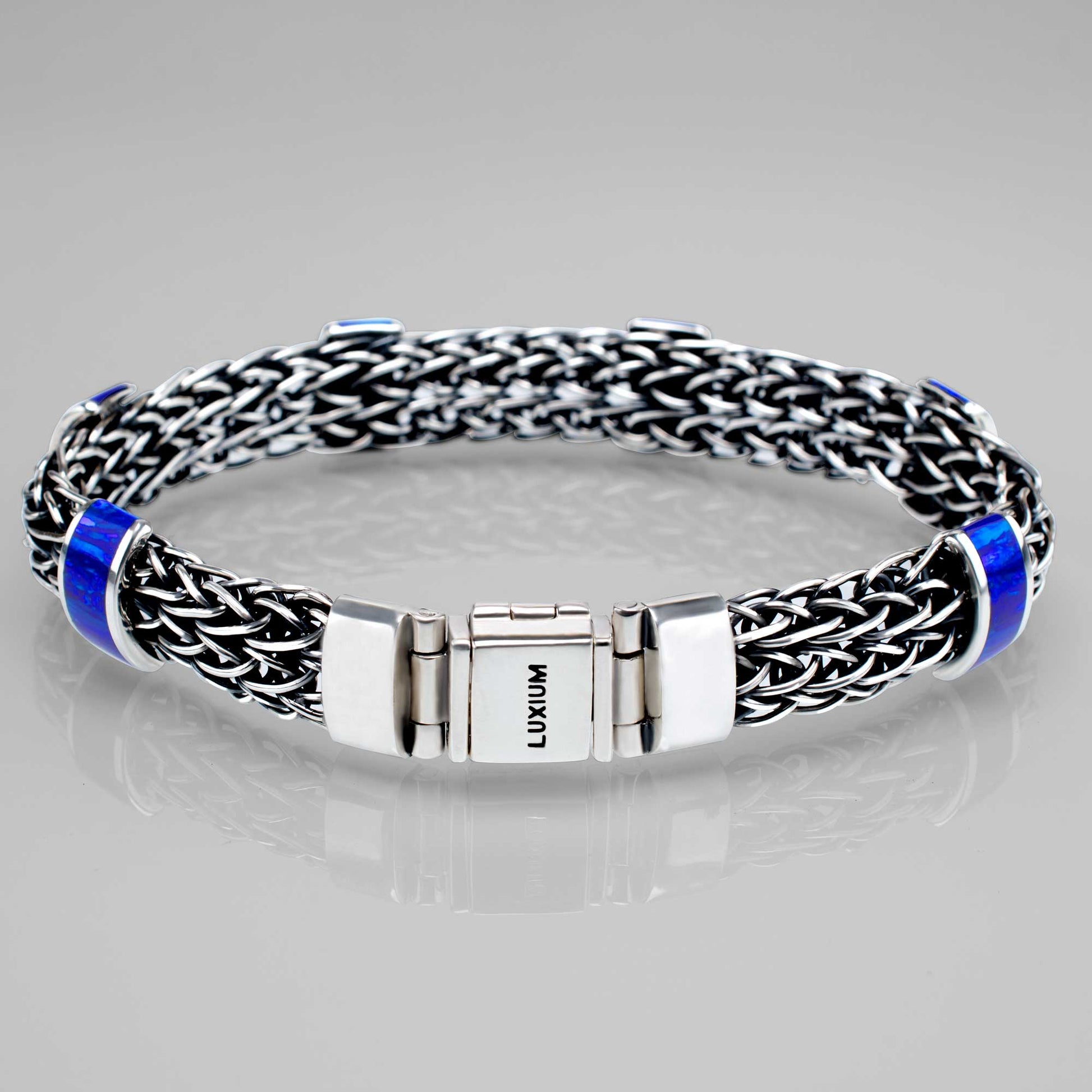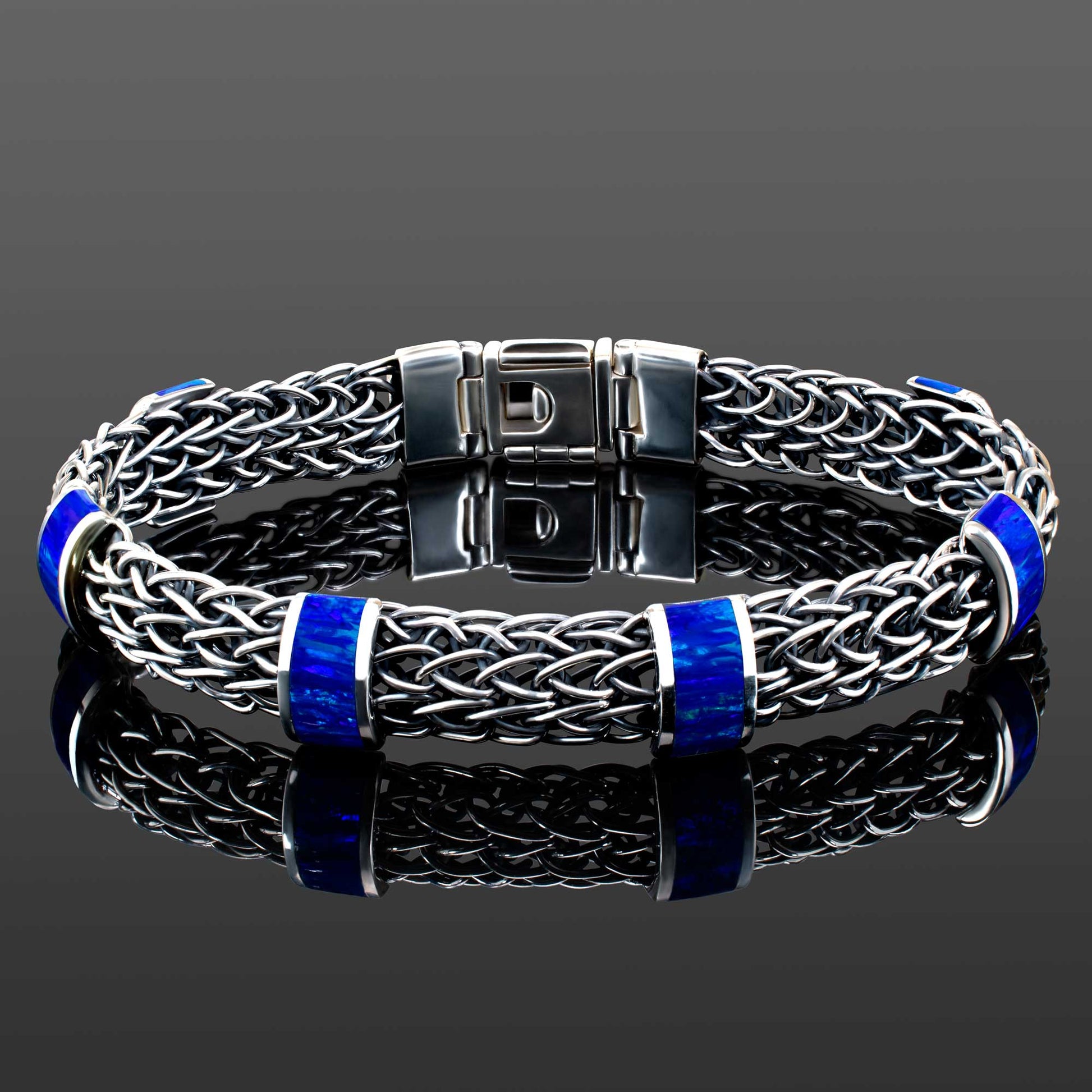 A bold fusion of craft and color — This bracelet is hand-braided from 925 sterling silver, acid-blackened for depth and contrast, then polished to a mirror-like shine. The inlaid blue opals lend an ethereal glow, radiating quiet luxury through its play of color and depth.. A striking piece that balances intricate design with refined brilliance.