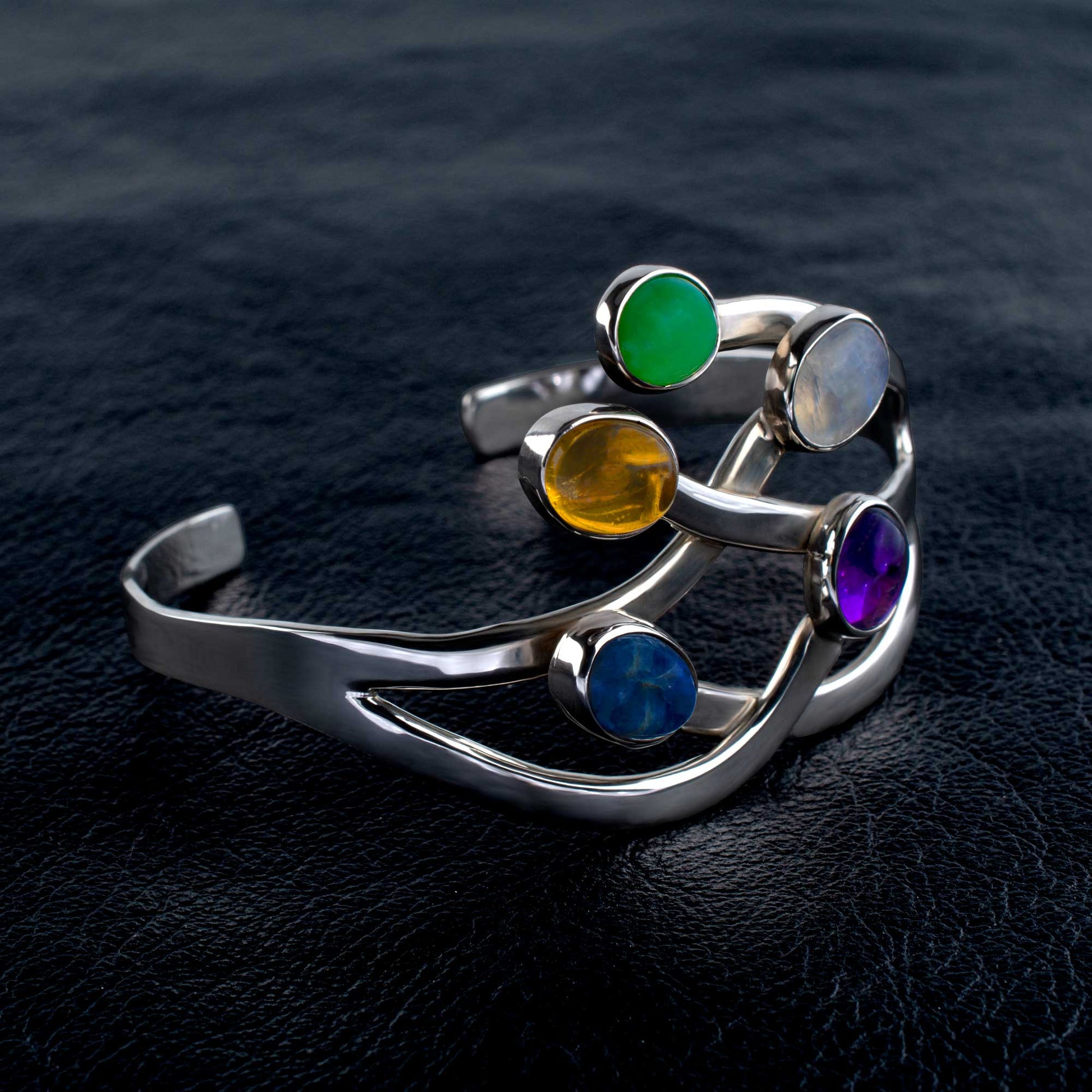 Handcrafted from polished 925 sterling silver, this cuff captures the eternal beauty of the Tree of Life. Its branches reach outward in graceful form, each crowned with a radiant gemstone—Amethyst for clarity, Moonstone for intuition, Aventurine for growth, Amber for warmth, and Sodalite for harmony. Together, they create a symphony of color and meaning, a reflection of nature’s wisdom and renewal. More than adornment, it is a timeless emblem of strength, balance, and connection.