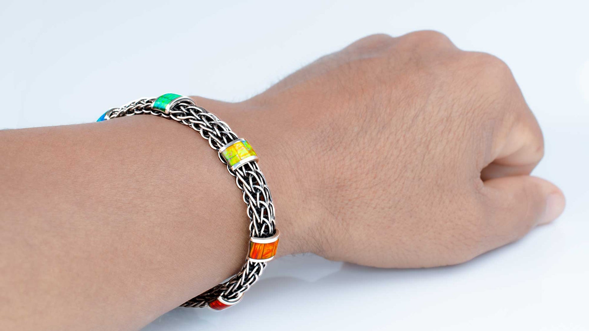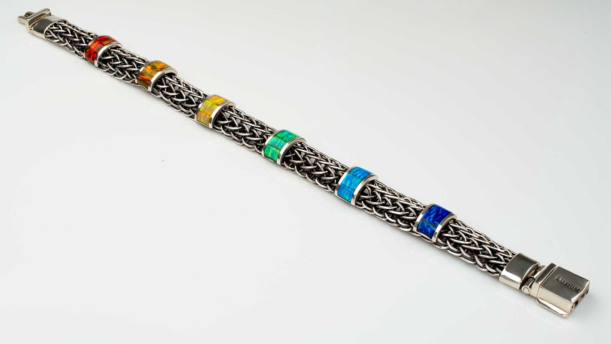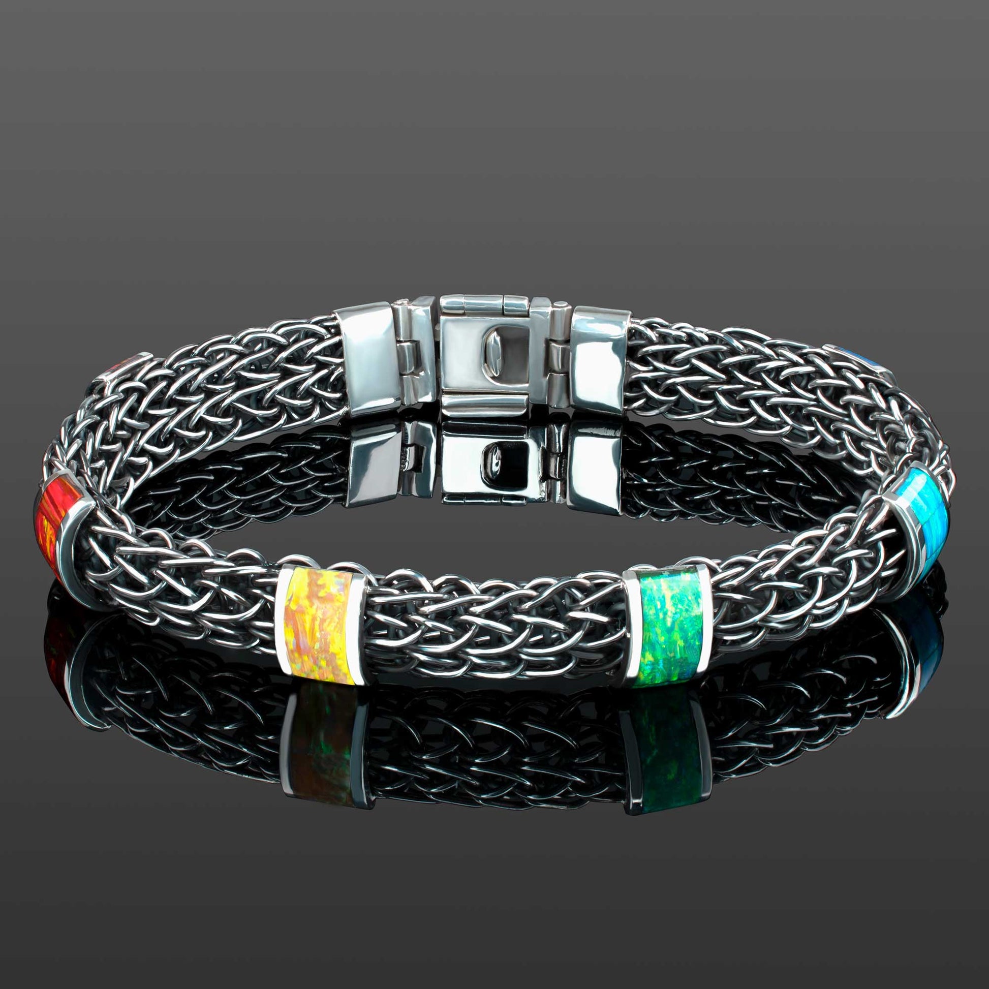 A bold fusion of craft and color — This bracelet is hand-braided from 925 sterling silver, acid-blackened for depth and contrast, then polished to a mirror-like shine. Iridescent multicolor opal gemstones are delicately inlaid, catching the light with every movement. A captivating interplay of artistry and elegance.